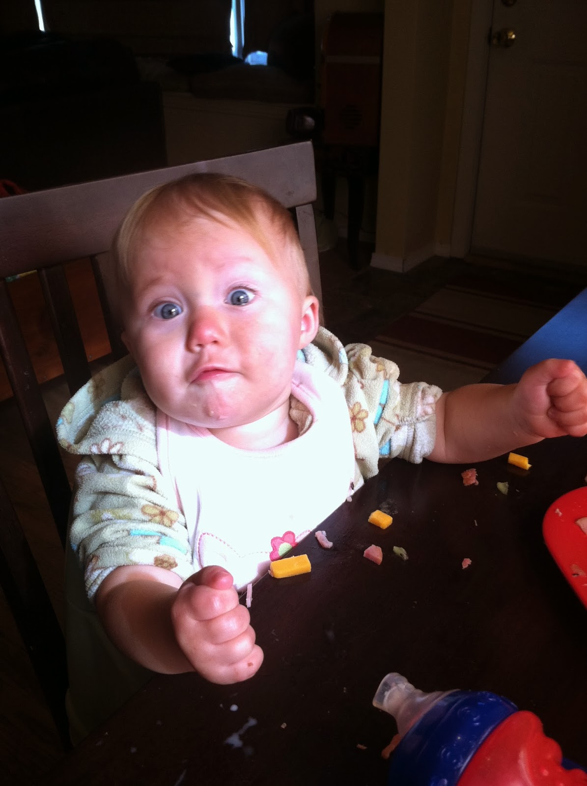 I heard brutal screams coming from the kitchen and found this mess: my daughter sitting on top of the gate blocking off the steps, her beloved blanket stuck underneath, and a little tuft of it was pulled through one of the holes. Don't ask me how this happened, all I know is that it was a very dramatic moment in our household. She signed "please" over and over again, begging for my help. It was so cute!